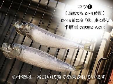 「丸干し」は焼く少し前に保冷バックから出しておけば、準備完了(*)。外の気温も高い季節なので、”半解凍”状態になるのも、そんなに時間がかかりません。「みりん干し」は、冷凍のまま焼いてOKです。袋から出して網の上に並べるだけ!生産者がこだわりぬいた塩加減・味付けで、タレも必要ありません。