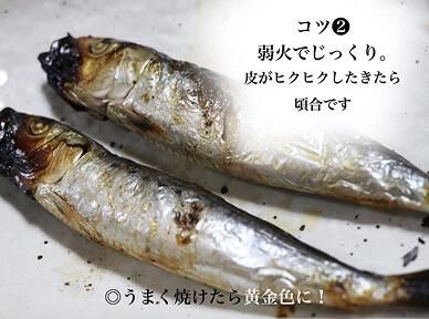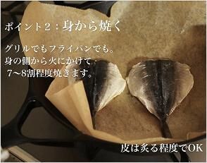 「特に強調してほしい!」と頼まれたのが、「身の方から焼く」というポイントです。グリルでもフライパンでも、炭火でも、身から火をかけて7〜8割程度焼き、皮は『炙る程度』でOK。